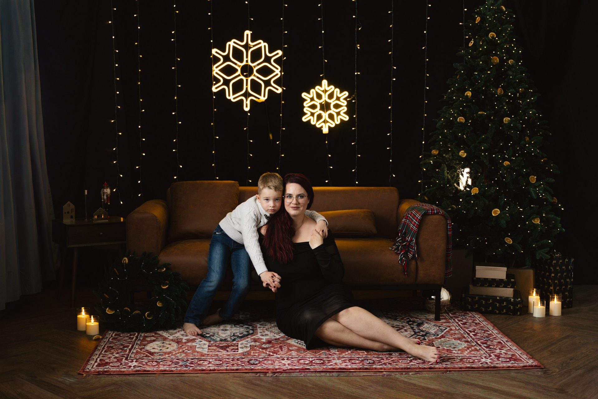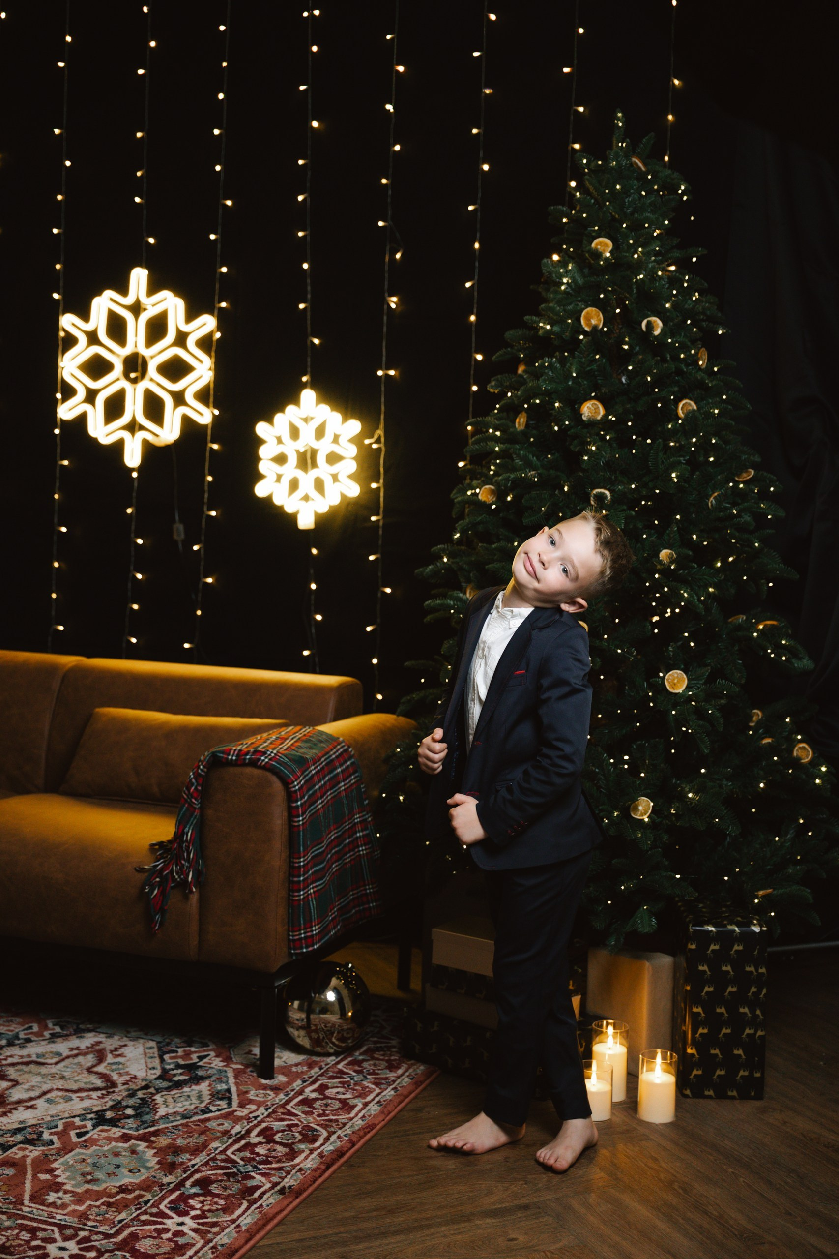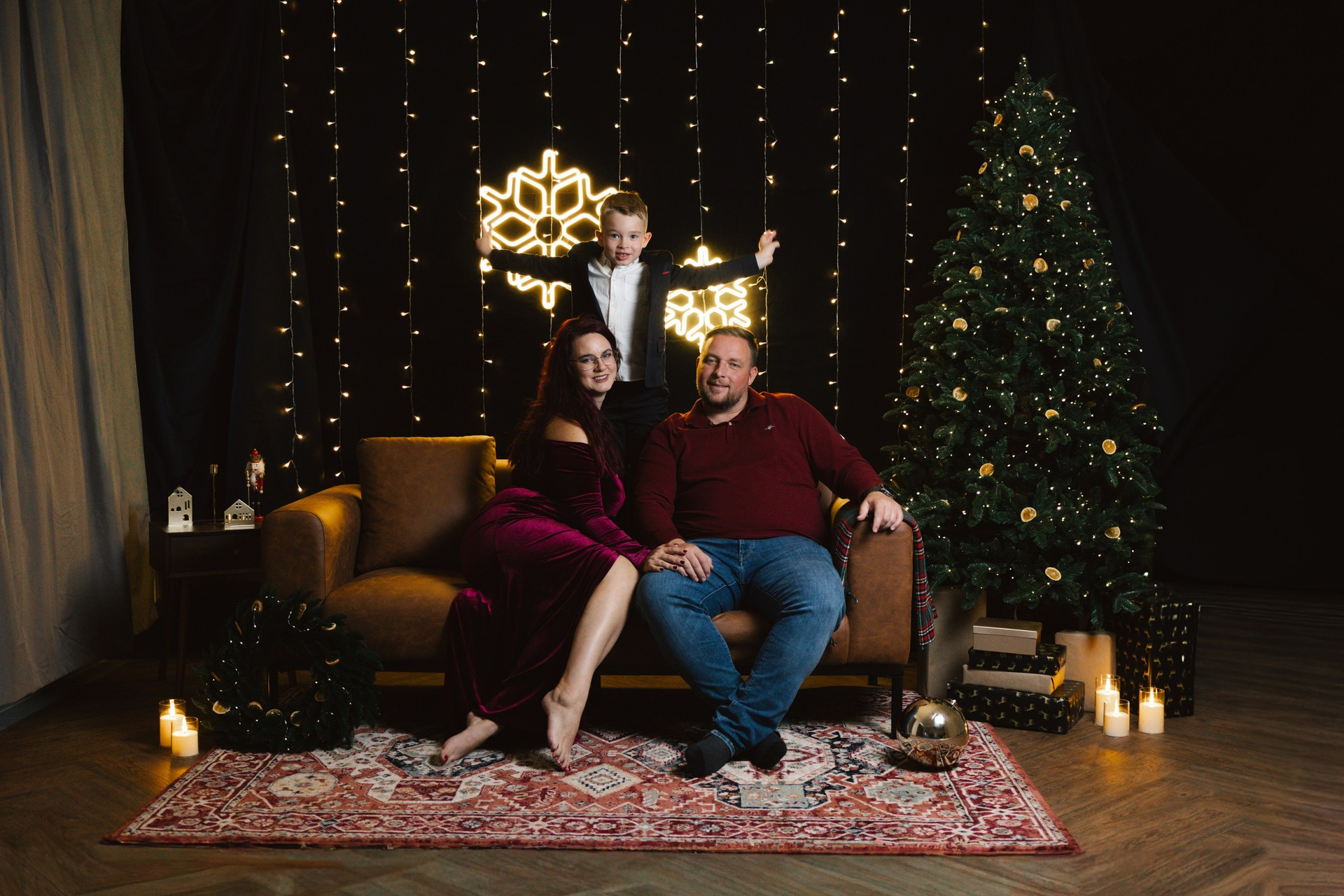 Hoooodně světýlek, kožený gauč, vintage koberec, stromek, věnec, pomeranče, zlaté detaily, svíčky…no a vy jako hlavní střed toho všeho :)