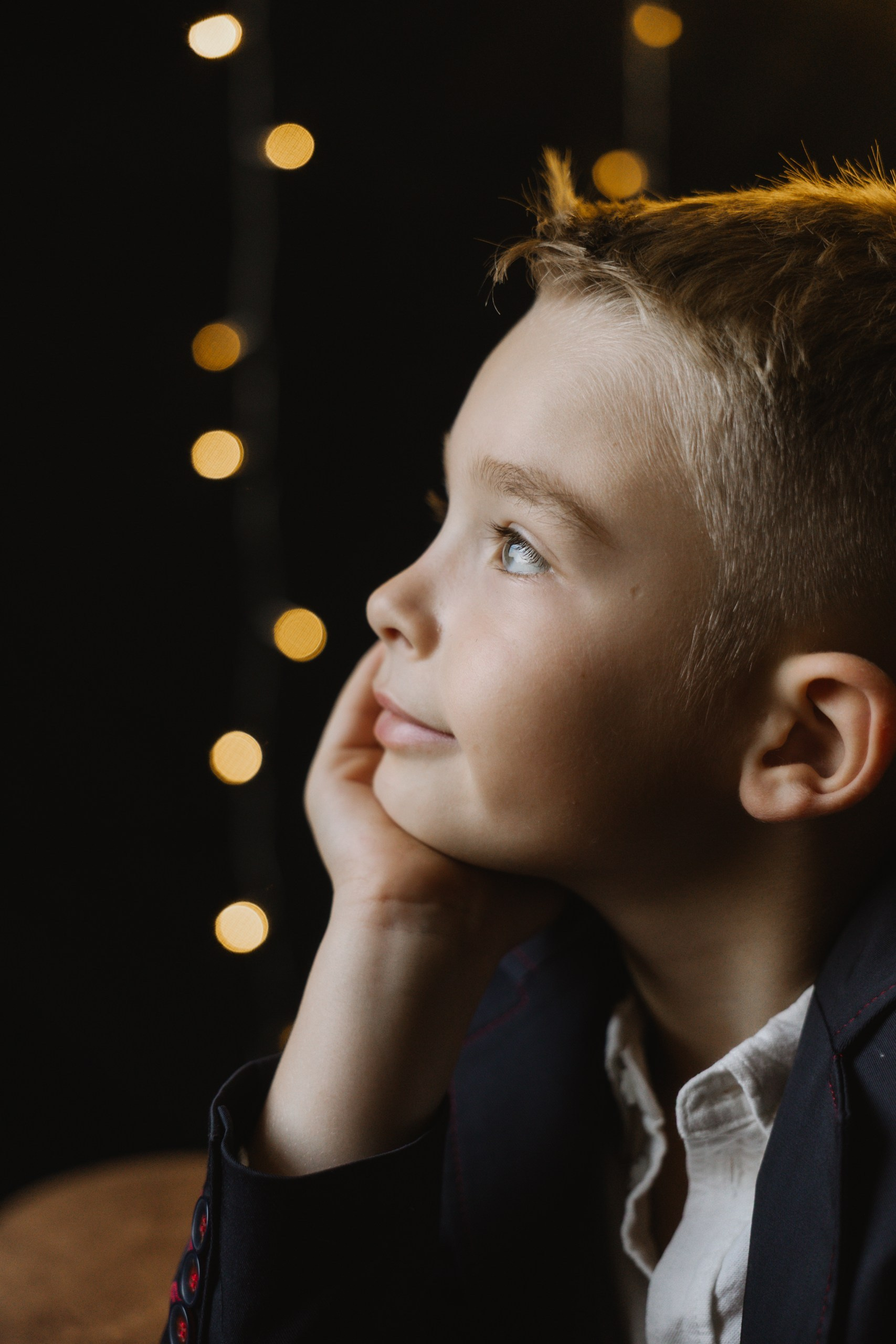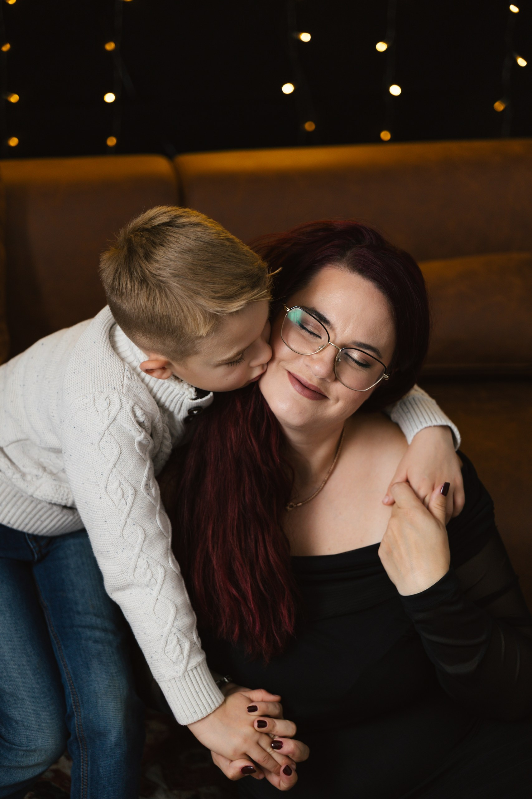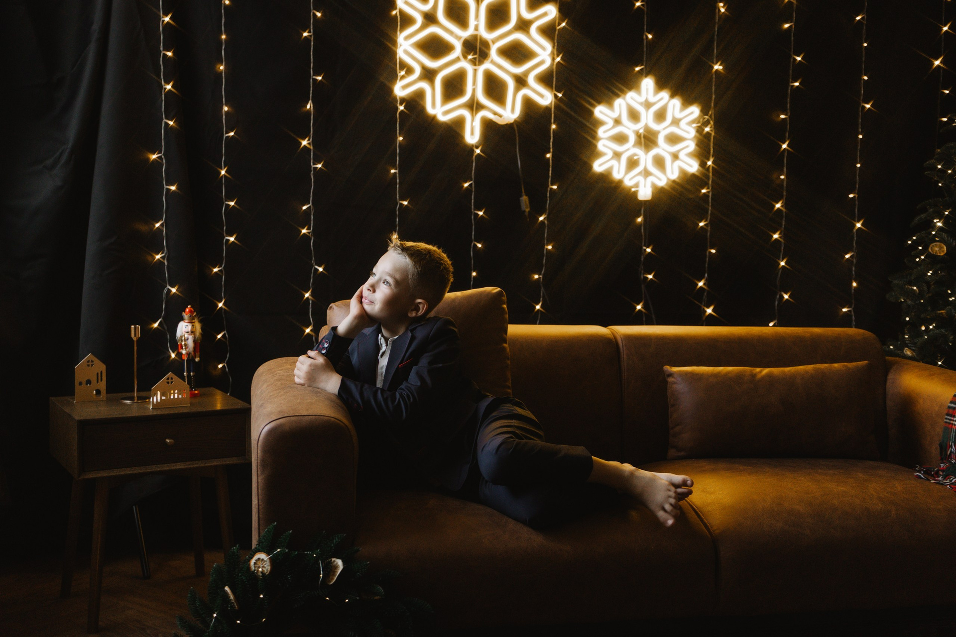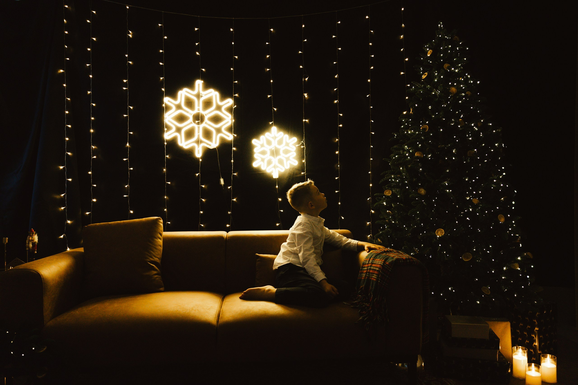 Hoooodně světýlek, kožený gauč, vintage koberec, stromek, věnec, pomeranče, zlaté detaily, svíčky…no a vy jako hlavní střed toho všeho :)